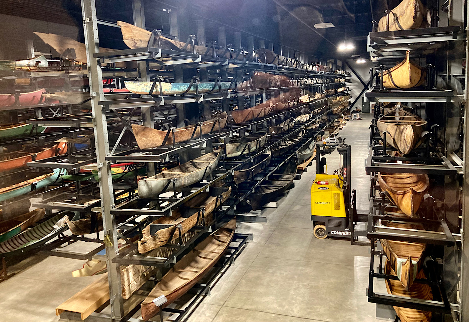From the upper landing, I looked through a glass wall into rows upon rows of canoes stacked in quiet order—ancient dugouts, delicate birchbark builds, elaborately carved coastal vessels, and sleek modern racers.